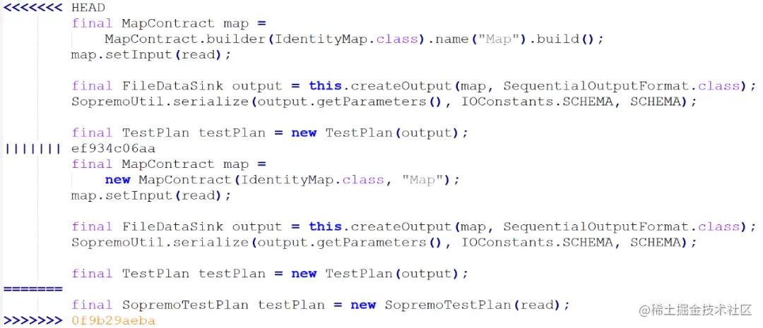 代码在同步入库环节会进行版本合并,当前一般采用主流的基于Git的版本合并工具。但该工具因采用了基于文本的合并策略,在合并的过程中不能理解代码变更双方的行为语义,导致Git的合并会产生大量冲突,这些冲突块如图10.8.6所示(图10.8.6、图10.8.7和图10.8.8的冲突块均来自于开源流处理框架Apache Flink,这些冲突块是在合入主干的过程中产生的,我们将其冲突现场进行了还原)。它包含冲突块的标识符“<<<<<<<|||||||======= *>>>>>>>”。我们将“<<<<<<<”到“|||||||”之间的代码块称为Ours版本,“|||||||”到“=======”之间的代码块称为Base版本,“=======”到“>>>>>>>”之间的代码块称为Theirs版本,所以一个冲突块包含三个版本的代码块。说明:使用命令git config --global merge.conflictstyle diff3才能看到合并的共同祖先,即Base版本。