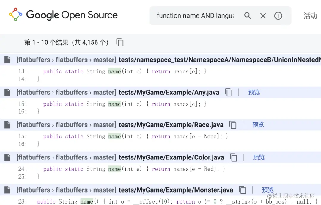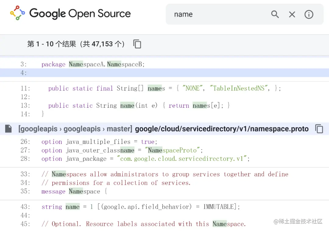 Google代码搜索除提供传统的代码字符串的检索功能外,也提供了代码精细化的检索功能,包括基于函数、类、注释,基于用法(排除代码中的注释和字面量),基于文件、大小写敏感等,还提供了“与、或”组合符来组合这些特征达到精细化检索的目的。例如,开发人员想要检索"name"函数的实现,若采用传统的字符串检索方式,其结果如图10.8.1所示,存在包名、变量等符号,这些对开发人员有很大的干扰。