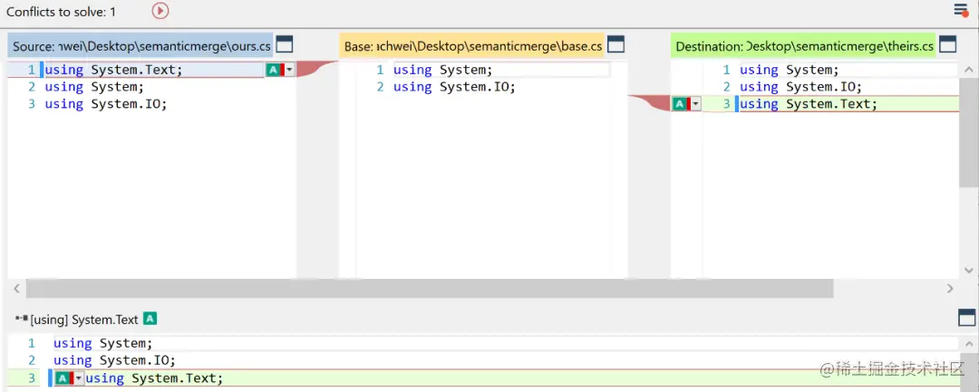 SemanticMerge是一款基于语义分析的代码合并工具。它能理解冲突块中三个版本的代码语义,特别是能识别类中函数移动这种重构场景的行为语义,但缺点是没有分析函数体内细粒度的变更行为语义。与Git Merge中基于文本的合并方式对比,其合并准确度提高很多,图10.8.9是SemanticMerge对import语句进行的语义合并。