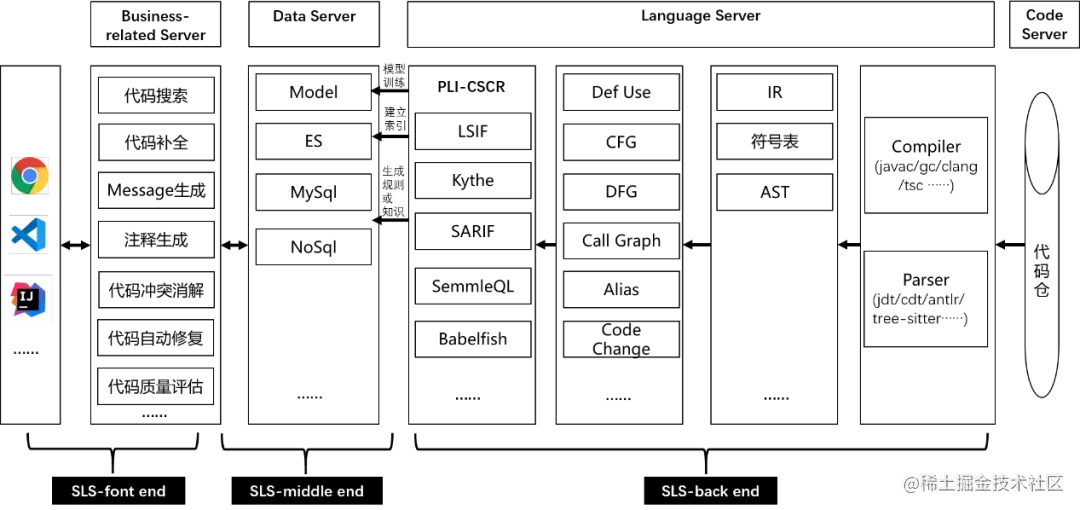 SLS-font end:根据不同的智能化业务场景,打通前端(如Chrome、IDEA、VSCode等)和业务相关的服务,其交互过程遵循微软提出的LSP规范。