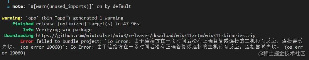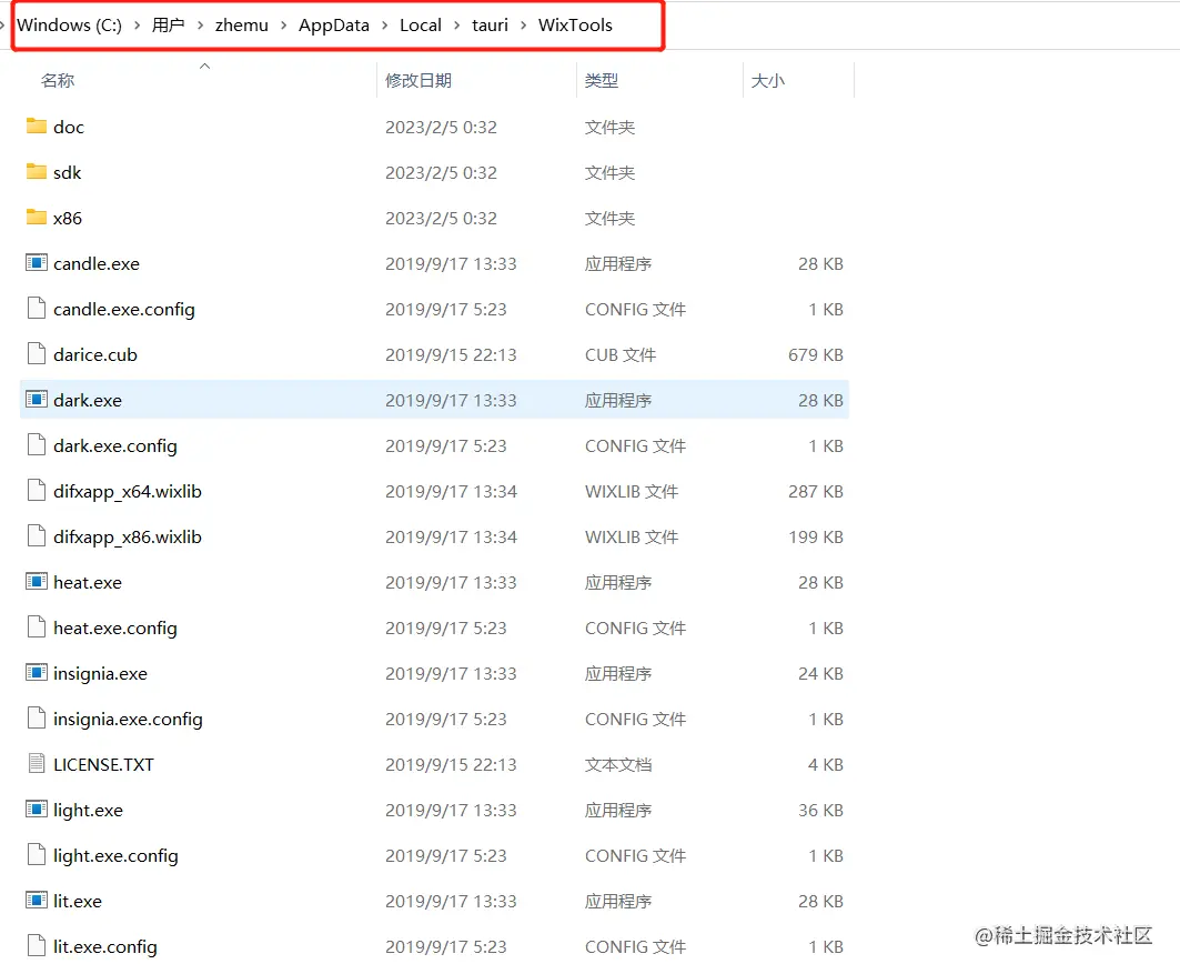 根据提示Downloading的链接下载该压缩包,下载完后,在本机 C:\Users\xxxxxxxx\AppData\Loca 中,创建 tauri/WixTools 文件夹,然后把内容解压到里面就可以了,解压后如下图,然后重新运行打包命令即可