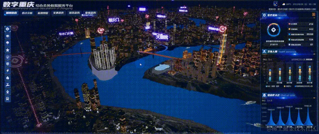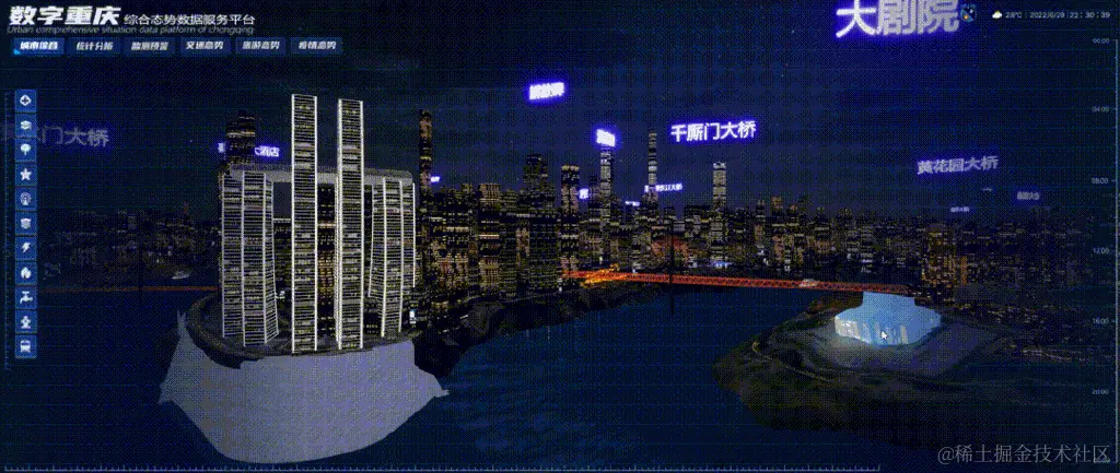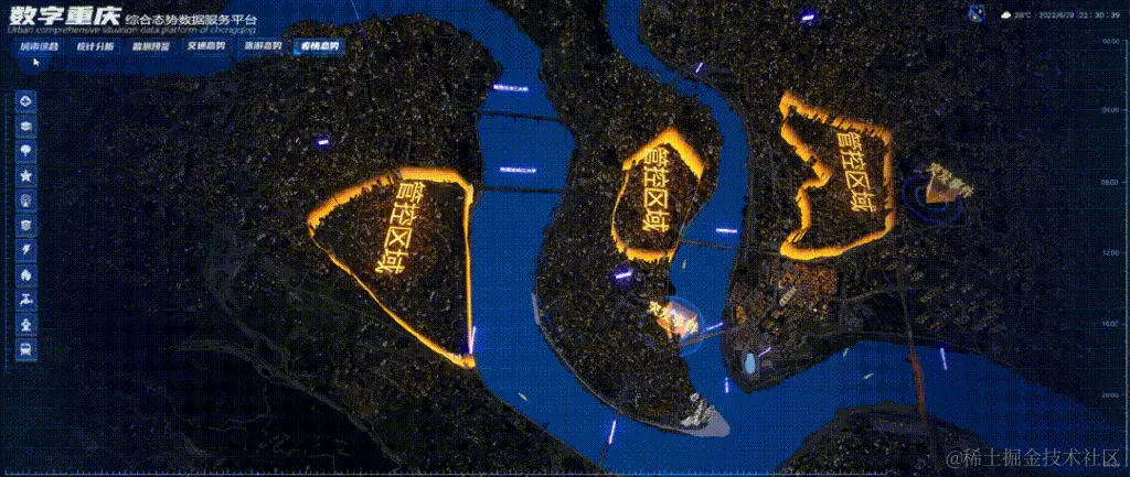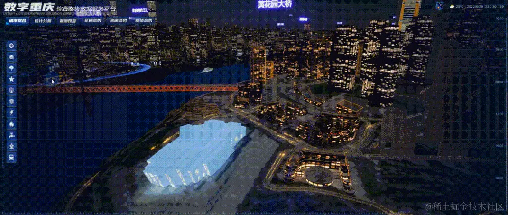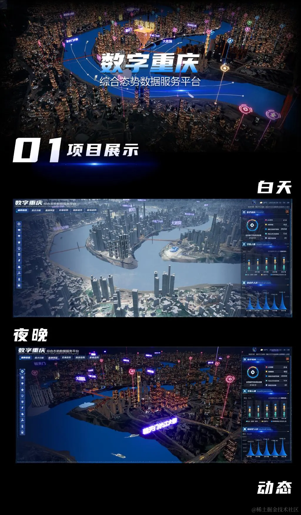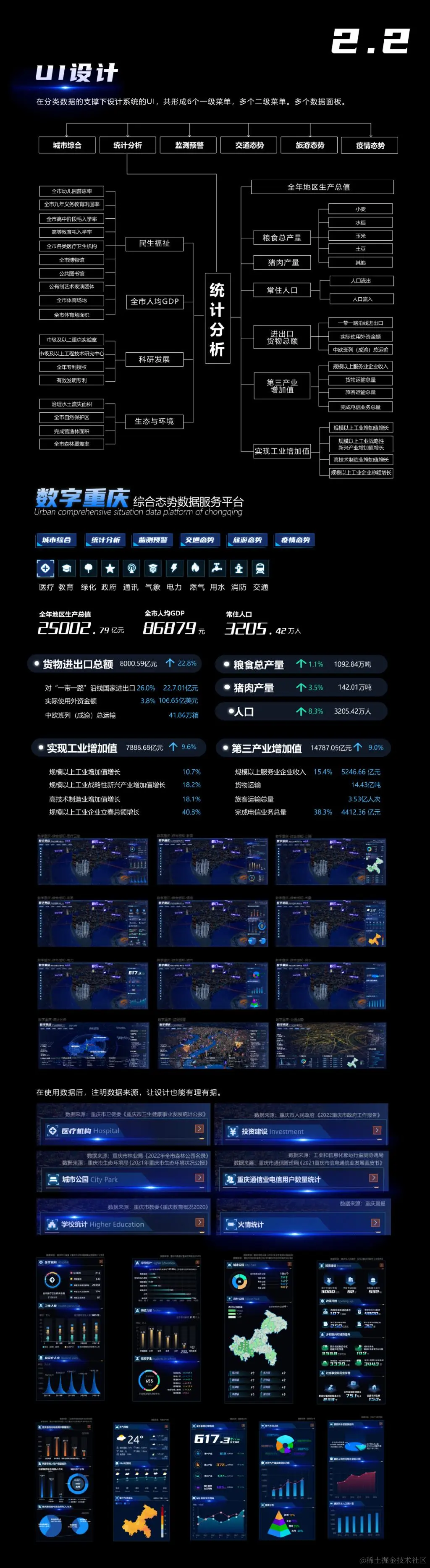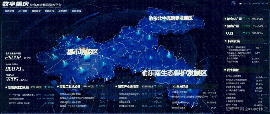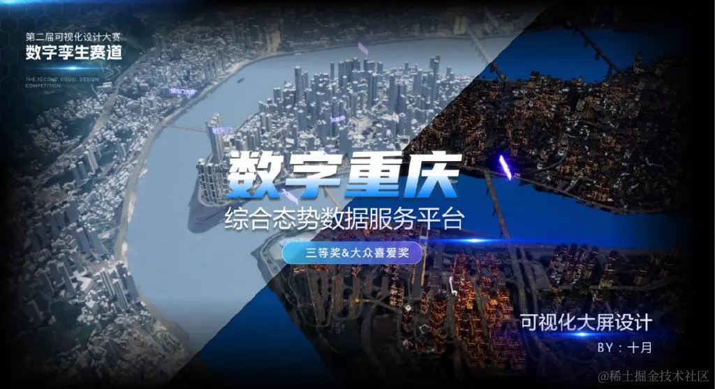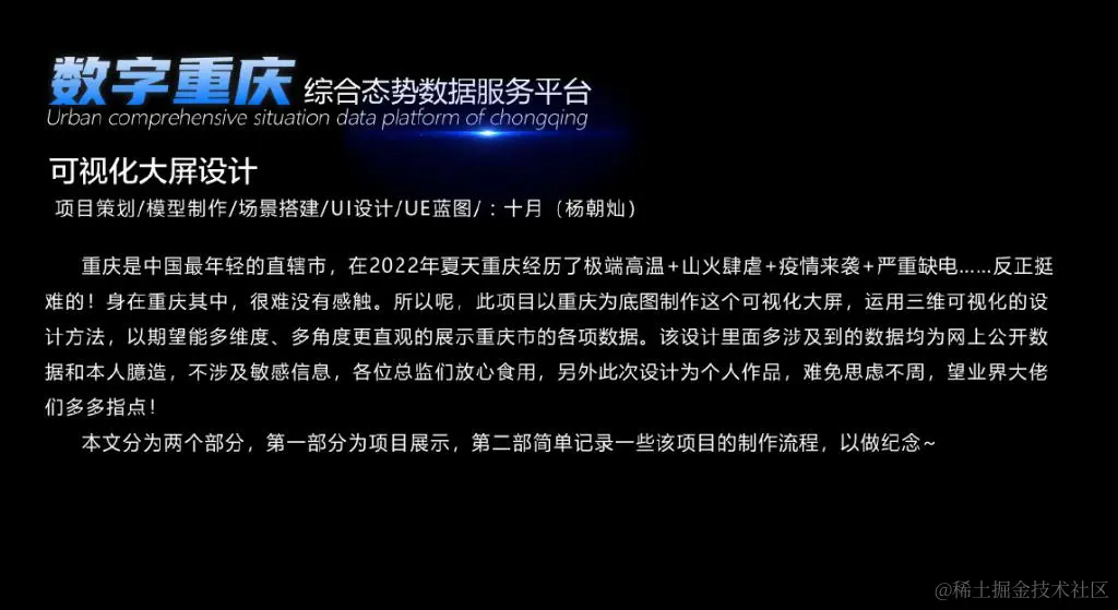 **作者引言:**重庆是中国最年轻的直辖市,在2022年夏天重庆经历了许多.....身在重庆,很难没有感触。所以,此项目以重庆为底图制作这个可视化大屏,运用三维可视化的设计方法,以期望能多维度、多角度更直观的展示重庆市的各项数据。该设计里面涉及到的数据均为网上公开数据和本人臆造,不涉及敏感信息,各位总监们放心食用,另外,此次设计为个人作品,难免思虑不周,望业界大佬们多多指点!