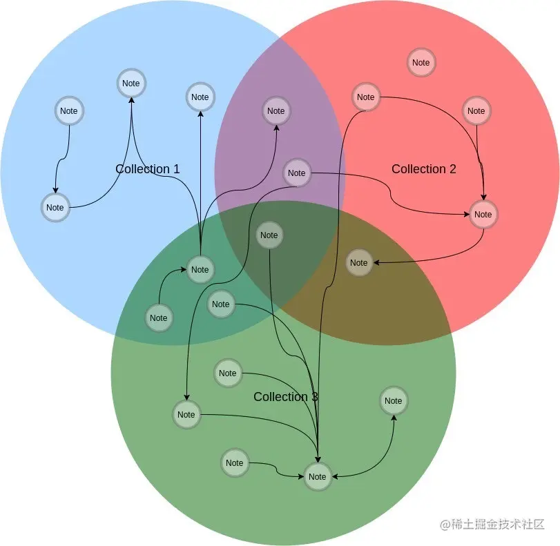这是区分PKB和记笔记应用程序的特征。 组织方案不应仅限于分层架构或仅限于标记架构。 相反,它应该足够强大以将节点链接在一起(我将输入的实体称为节点)并单独标记它们。 这两个概念(链接和标记)非常强大,相互补充,提供有关节点及其关系的额外信息(有关三个标签/集合的示例,请参见下图)。