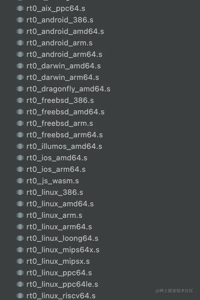 这样我们就找到了go程序的入口rt0_linux_amd64.s,这是在linux系统下程序的入口,其实go程序在不同系统和cpu架构下,会有不同的入口,比如mac os的程序入口就分别有:rt0_darwin_amd64.s 和 rt0_darwin_arm64.s。