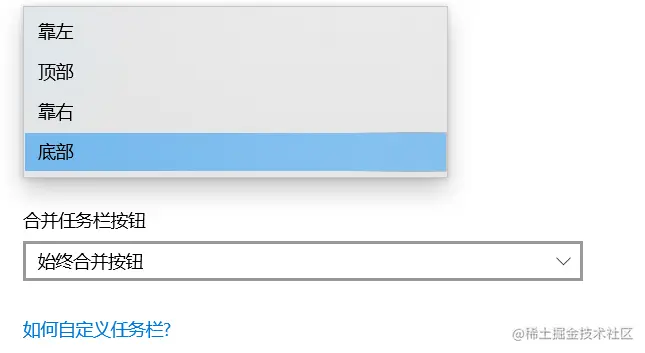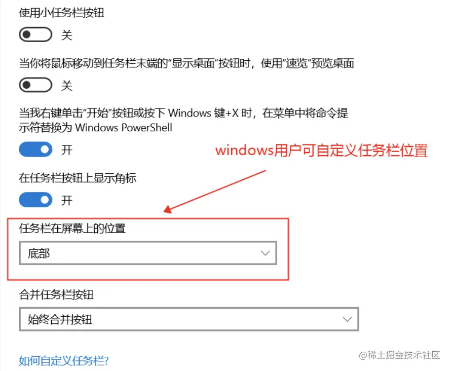 注意:在 Mac 和 Windows 上,托盘的位置是不一样的,Windows 默认是左下角,但是 Windows 系统上的任务栏的位置是可以让用户自定义的: