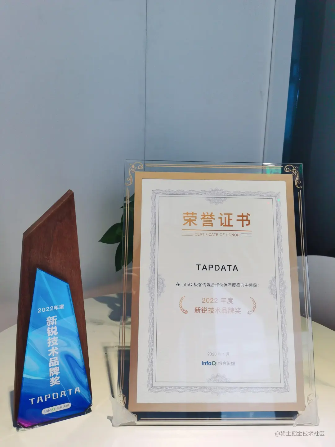 年初,知名技术社区 InfoQ 在以“微光成炬·破晓而出”为主题的合作伙伴年度盛典上,发布了一系列重磅奖项。当日,2022 年度新锐技术品牌奖被授予在过去一年对技术创新起到推动作用的15家年轻企业,Tapdata 凭借在技术品牌建设层面的出色表现获得广泛认可,位列其中。