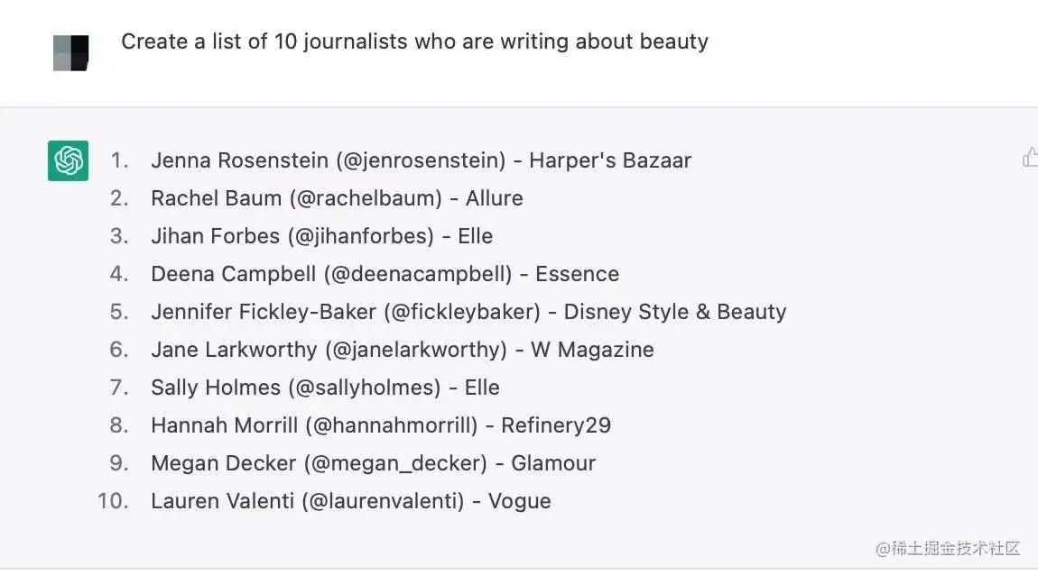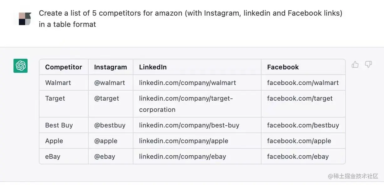 - 市场调查。对您需要分析的竞品对象,以及分析提纲告诉chatGPT,它将以表格或者列表形式列出您所需要调研的竞品信息,以便您可以更系统的查阅。更厉害的,你还可以要求chatGPT针对特定行业或专家进行调研。(例如,顶级投资公司的CFO名单)。