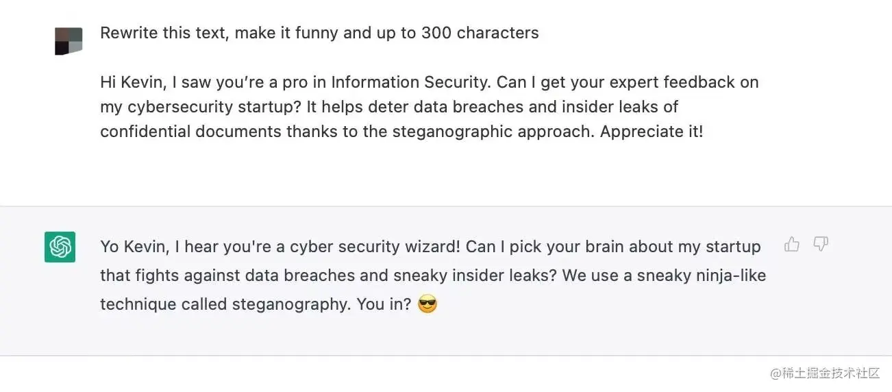 - 为某类目标目标受众写个性化的信件。一般我们说的数字营销(如短信、邮件),每一次的用户触达,都需要营销人员的创意及相当一段时间的撰写。chatGPT类的AI则可以在短时间内,给营销人员输出不错的“创意”。(例如,对于 LinkedIn 上限制为 300 个字符的第一条消息。)