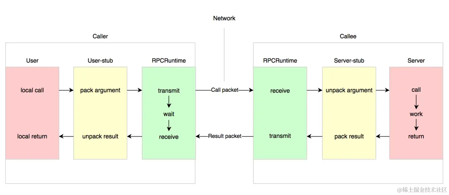 RPC的概念模型: 在RPC调用中,本地的User(Client端)发起一个远程调用时,先本地调用User-stub,User-stub 负责将调用的接口、方法和参数通过约定的协议规范进行编码并通过本地的 RPC-Runtime 实例传输到远端的实例。 远端 RPCRuntime 实例收到请求后交给 Server-stub 进行解码后发起向本地端 Server 的调用,调用结果再返回给 User 端。