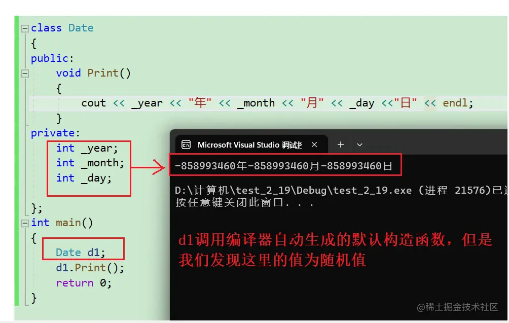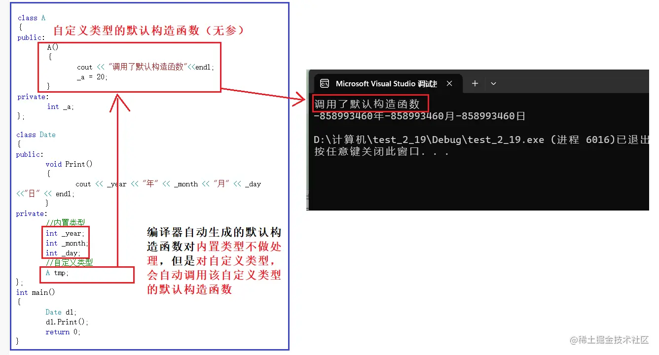 我们发现编译器自动生成的默认构造函数竟然没有给我们的数据做初始化处理,这是为啥呢?实际上是我们的祖师爷埋下的一个大坑:默认构造函数对内置类型(int double char...)不做处理,但是对自定义类型(struct class union)会自动调用它所对应的默认构造函数。我们下面来实验一下会发现确实如此:
