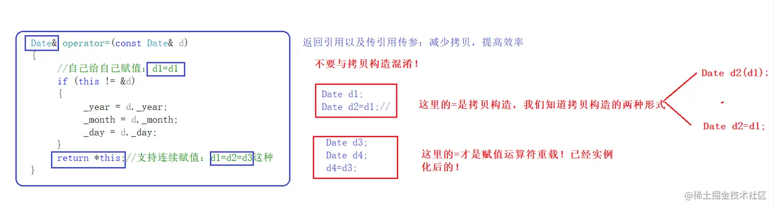 另外,我们不要与拷贝构造记混了,拷贝构造是给实例化对象初始化,此时实例化对象还没有创建完成,但赋值是两个都已经实例化后的对象,a的值赋值给b,b=a,此时a与b都是以及实例化后的。