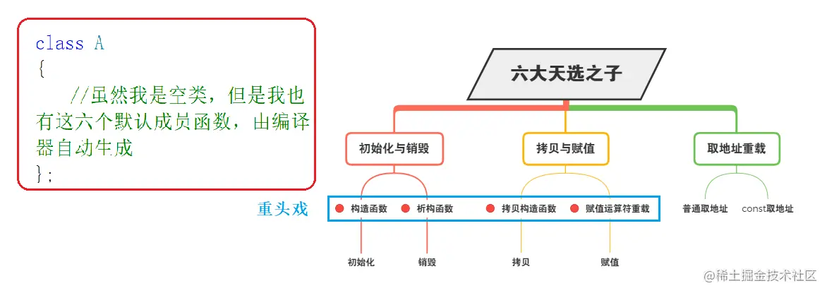 每个类中都含有六大默认成员函数,也就是说,即使这个类是个空类,里面什么都没有写,但是编译器依然会自动生成六个默认成员函数,可以说它们六个是祖师爷钦点的“天选之子” 。如下图所示: