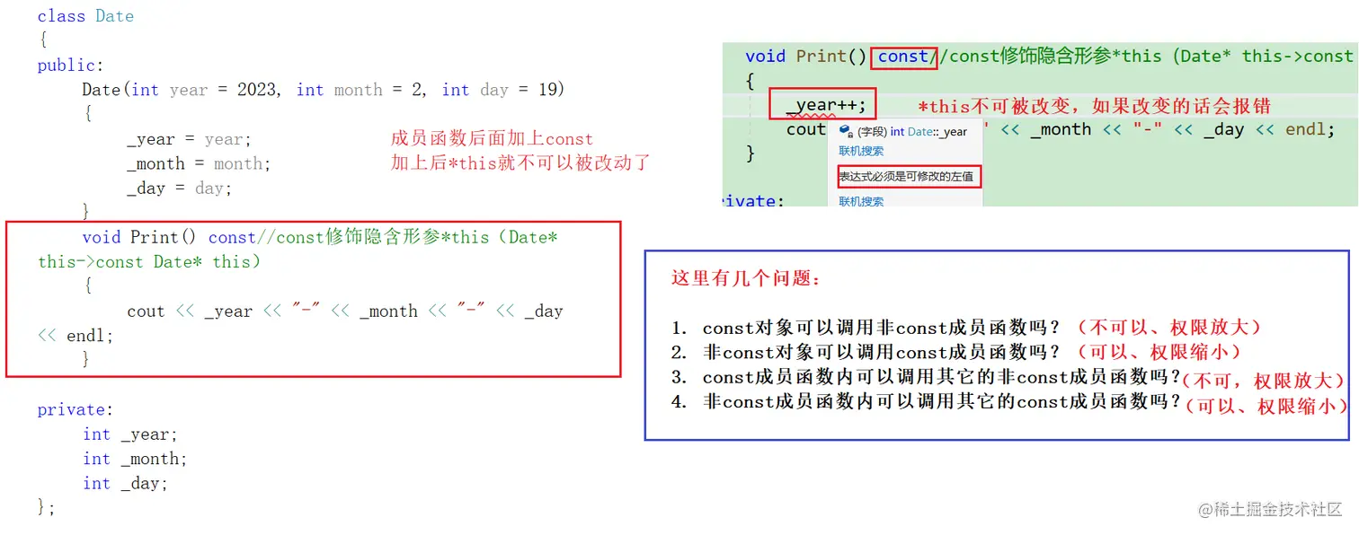 const成员函数其实就是在成员函数后面加个const,这里的const修饰的是隐含形参:this指针! *const放在成员函数后面后,this即调用这个函数的类对象里的数据便不可以发生修改!