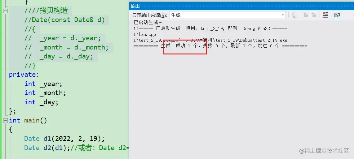 当然,由于编译器生成的默认拷贝构造既然已经可以实现一个字节一个字节拷贝,也就是浅拷贝(值拷贝) ,那么对于这种日期类对象,我们可以不写拷贝构造函数,因为编译器自动生成的已经够用了,我们把代码屏蔽,依然可以编译通过,实现拷贝。