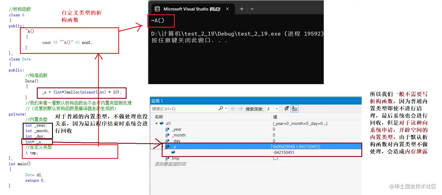当然,在析构函数这里也存在着一个大坑,与默认构造函数相同 ,由于析构函数不支持重载,所以我们写的实际上就是默认析构函数,它在清理资源时对内置类型不做处理,对自定义类型会调用该自定义类型的默认析构函数。