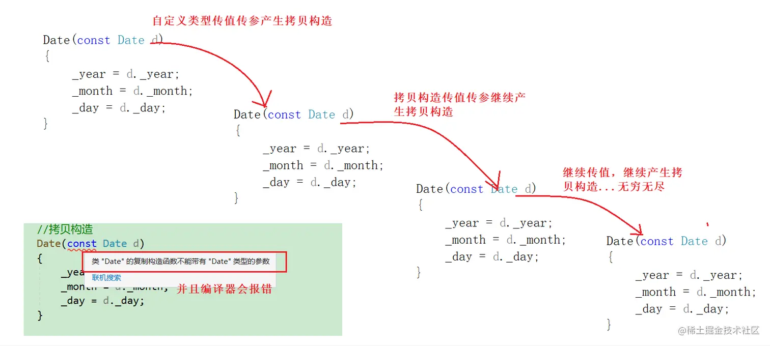 对于自定义类型,在传值传参的时候会·产生拷贝构造,而调用拷贝构造函数又需要传参,传值传参又会产生拷贝构造...(无限套娃)