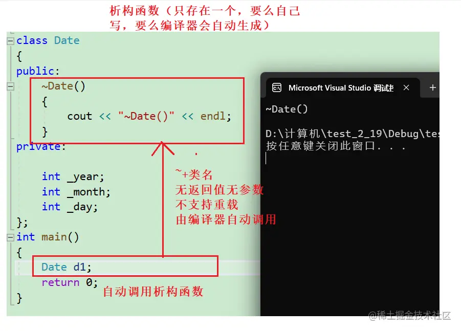 一个类只能有一个析构函数。若未显式定义,系统会自动生成默认的析构函数。注意:析构函数不能重载(只能存在一个,要么是编译器自动生成的,要么是自己写的)