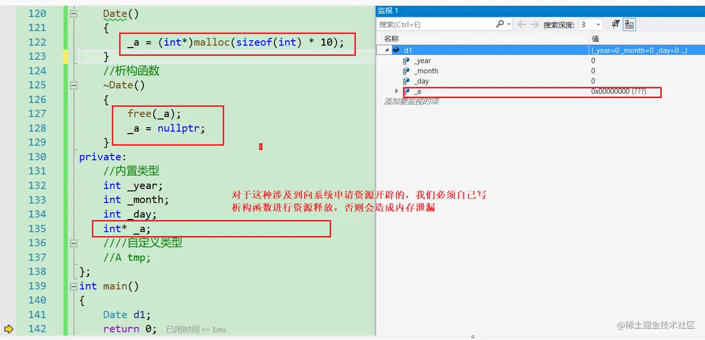 对于普通的内置类型,我们不需要写析构函数(写了后我们自己的就是默认析构函数),编译器自动生成的就够用了,但是对于向系统申请空间,涉及到动态内存开辟的,则必须由我们自己写析构函数进行释放资源,不然会造成内存泄漏。