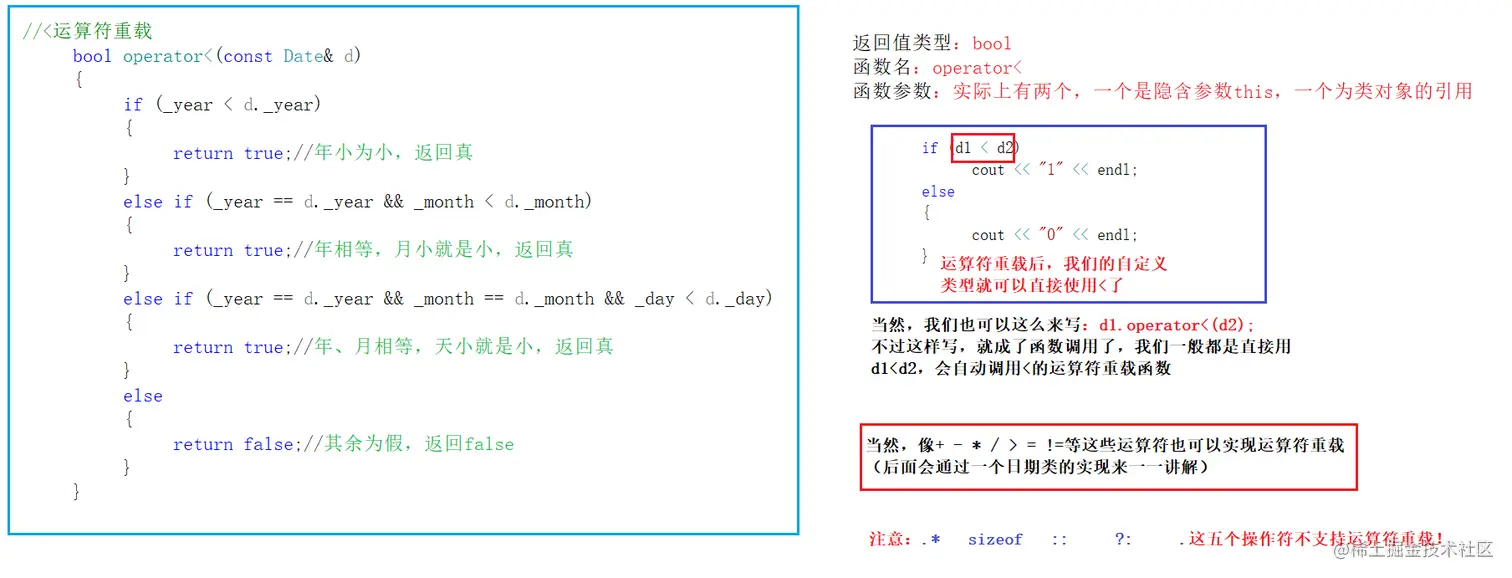 C++为了增强代码的可读性引入了运算符重载,所谓运算符重载的用处是什么呢?实际上就是是我们的自定义类型也可以直接使用操作符进行操作。就比如说,整型a大于整型b,我们可以直接用>进行判断,但是对于自定义类型来说,这里就不能直接使用>。