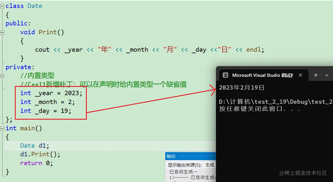 不过对于这个大坑,C++11中新增了一个补丁(一些老版本的编译器可能不支持) :可以在声明时给内置类型一个缺省值:如下