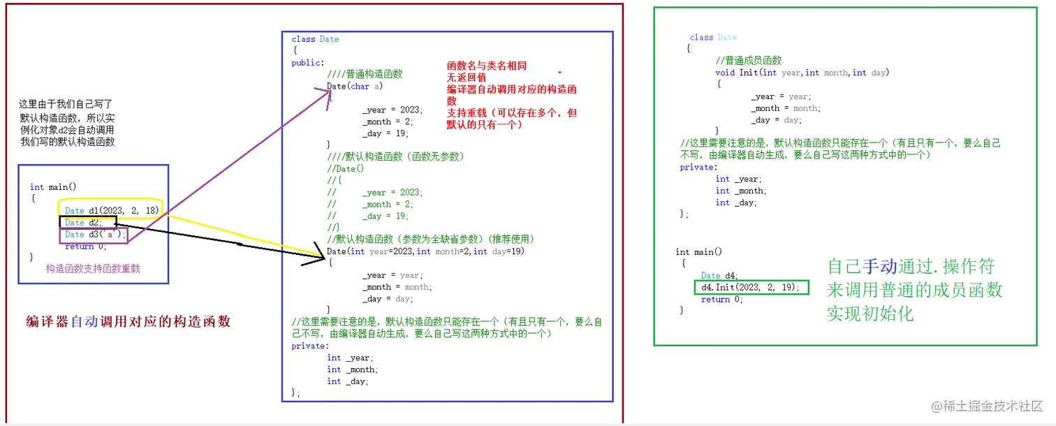 首先来谈谈它的作用,就是减少我们手动初始化,实现自动初始化。就比如下面的代码,我们要想对对象进行初始化,就要调用函数Init,会很麻烦,而构造函数就是为了解决这个麻烦的。接下来我们先谈一谈它的创建规则