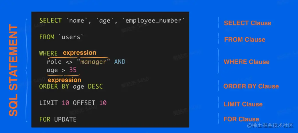 SQL 语句的结构拆分为:| 语句 | 确定含义 | |--------|-------| | Select | 语句 | | From | 表格 | | Where | 选择条件 | | Order By | 排序条件 | | Limit | 上下限条件 | | For | 加锁 |