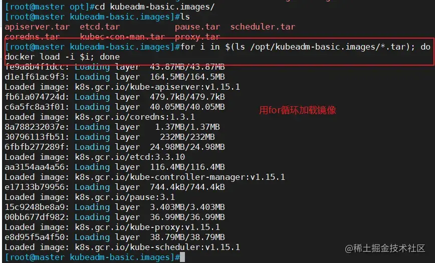 for i in $(ls /opt/kubeadm-basic.images/*.tar); do docker load -i $i; done
