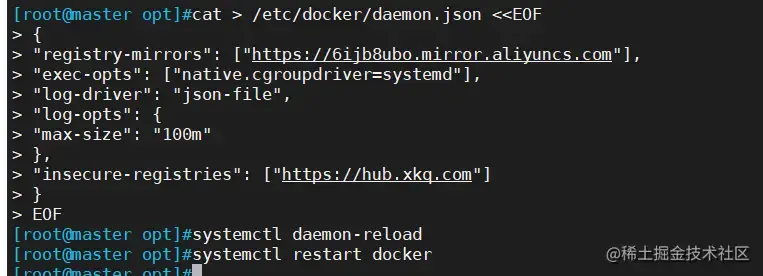 cat > /etc/docker/daemon.json <<EOF### 下面命令也需要在master和node节点重新执行,因为之前没有指定harbor仓库地址