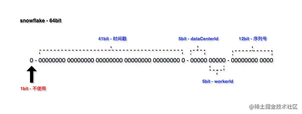 默认的雪花算法是 64 bit,具体的长度可以自行配置。如果希望运行更久,增加时间戳的位数;如果需要支持更多节点部署,增加标识位长度;如果并发很高,增加序列号位数
