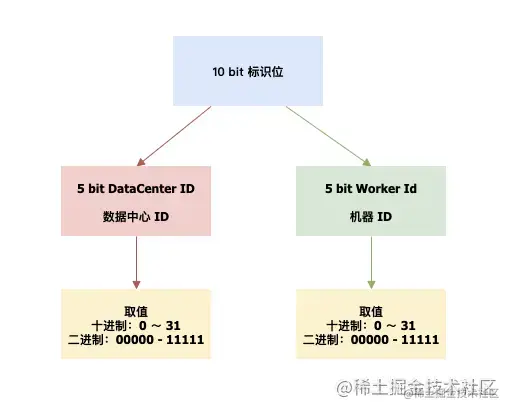 标识位:5bit 数据中心 ID,5bit 工作机器 ID,两个标识位组合起来最多可以支持部署 1024 个节点(2^10 = 1024 个节点)