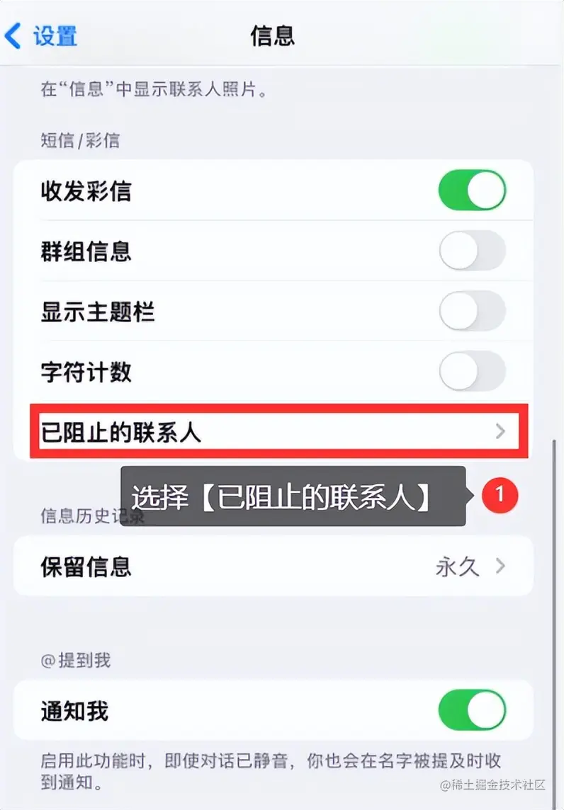 **步骤2:**找到【短信/彩信】的板块,选择【已阻止的联系人】,将垃圾短信的手机号码添加进去,从此再也不用接收该手机号码发来的垃圾短信了。
