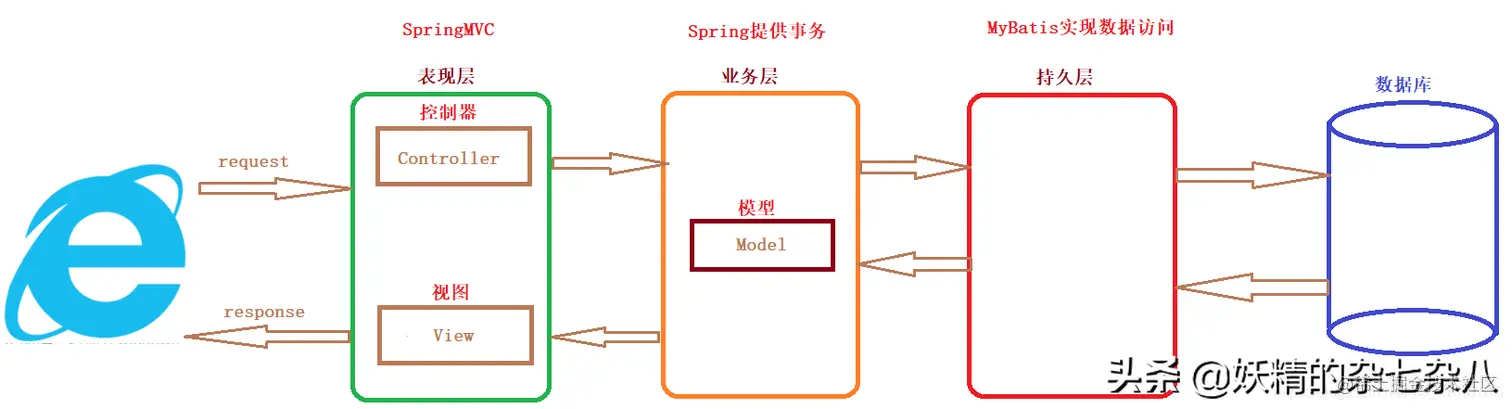 其中 web层相当于mvc中的view+controller,Service层和dao层相当于mvc中的model。