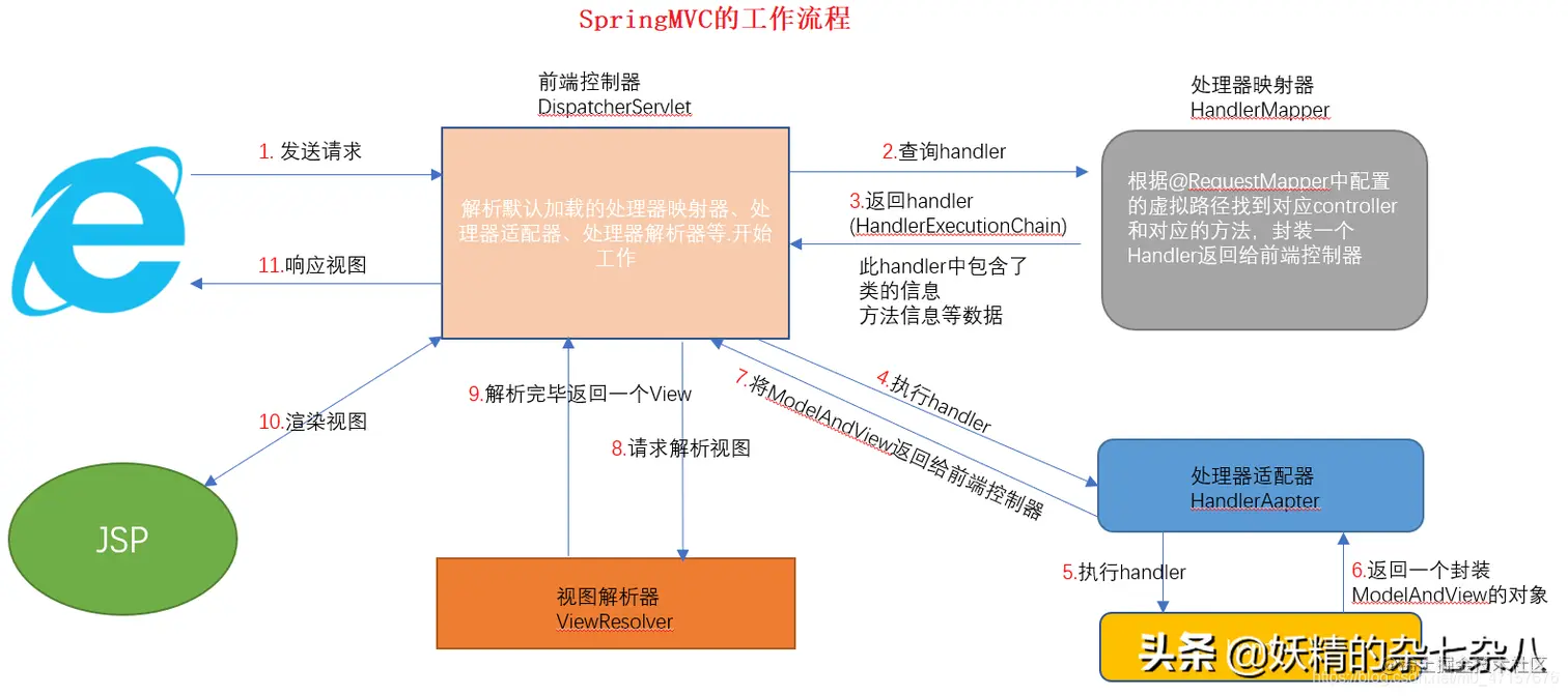 在 SpringMVC 的各个组件中,处理器映射器、处理器适配器、视图解析器称为 SpringMVC 的三大组件。