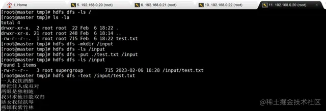 使用命令:hdfs dfs -get /input/test.txt ./tmp 将HDFS文件复制到本地目录