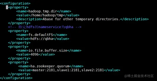 文件2: core-site.xml; 配置临时目录及zookeeper信息