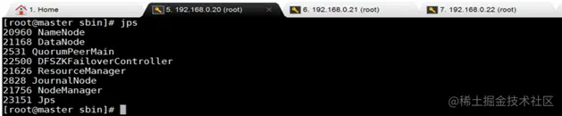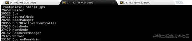 | slave1 | 192.168.0.21 | QuorumPeerMain、NameNode、DataNode、ResourceManager、NodeManager、JournalNode、DFSZKFailoverController、Master、Worker |