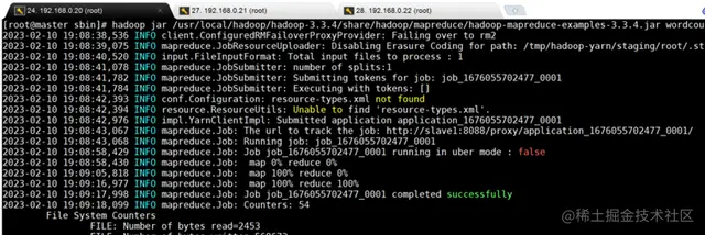 hadoop jar /usr/local/hadoop/hadoop-3.3.4/share/hadoop/mapreduce/hadoop-mapreduce-examples-3.3.4.jar wordcount /input/test2.txt /out