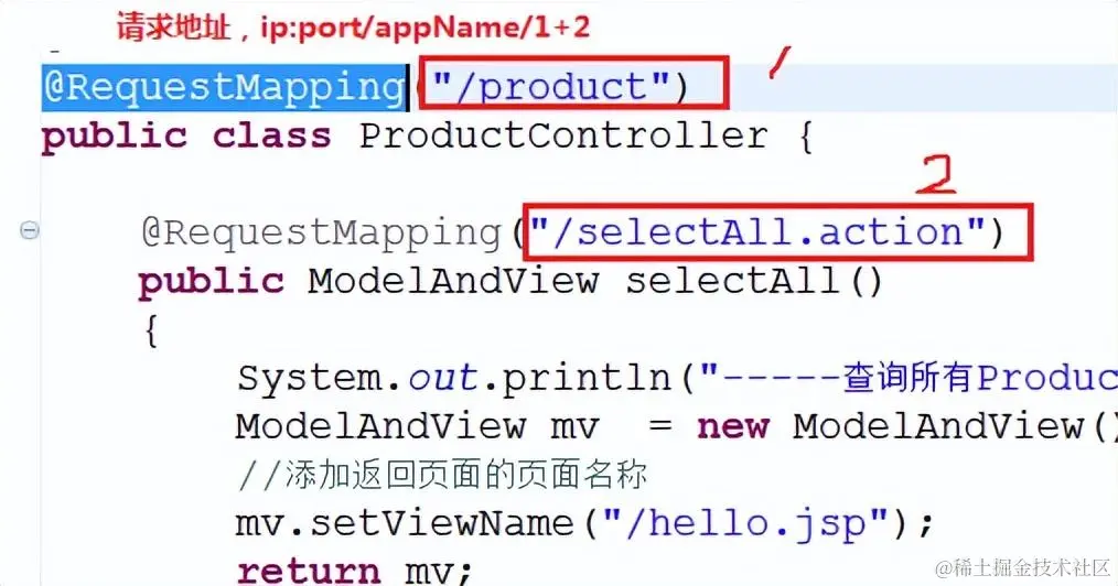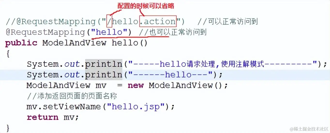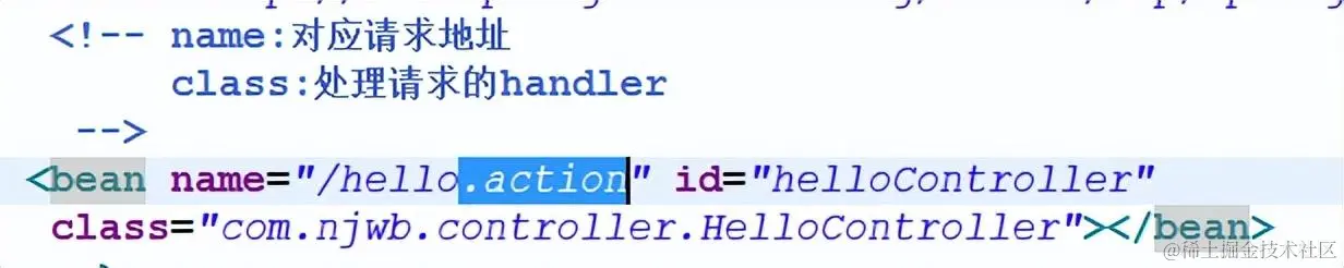 teacher_springmvc/hello.action ,web.xml中,有个servlet配置,接收*.action的请求,请求地址hello.action符合要求,那么tomcat就会把这个请求丢给DispatcherServlet