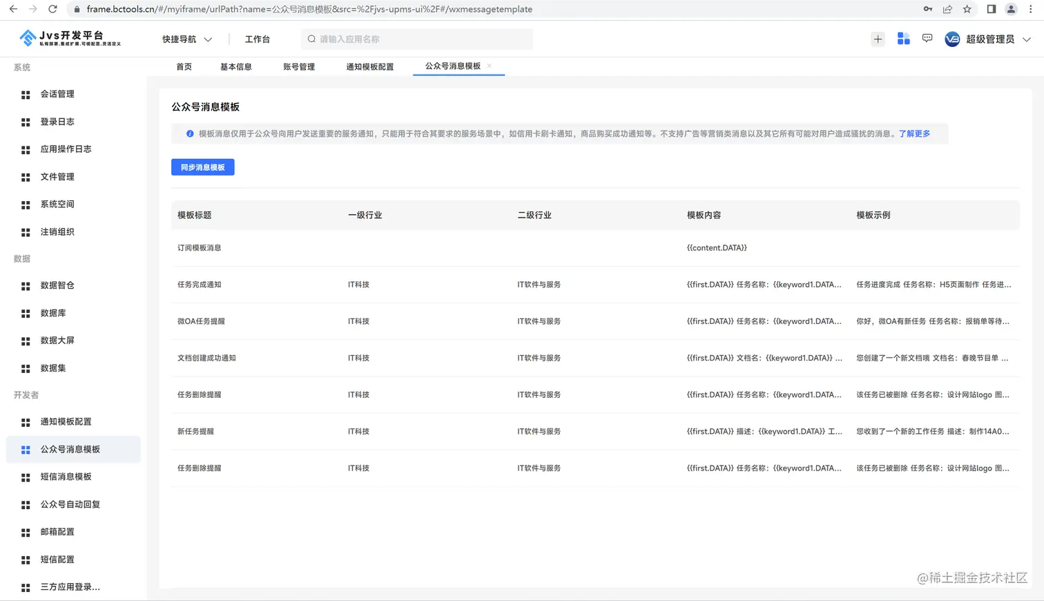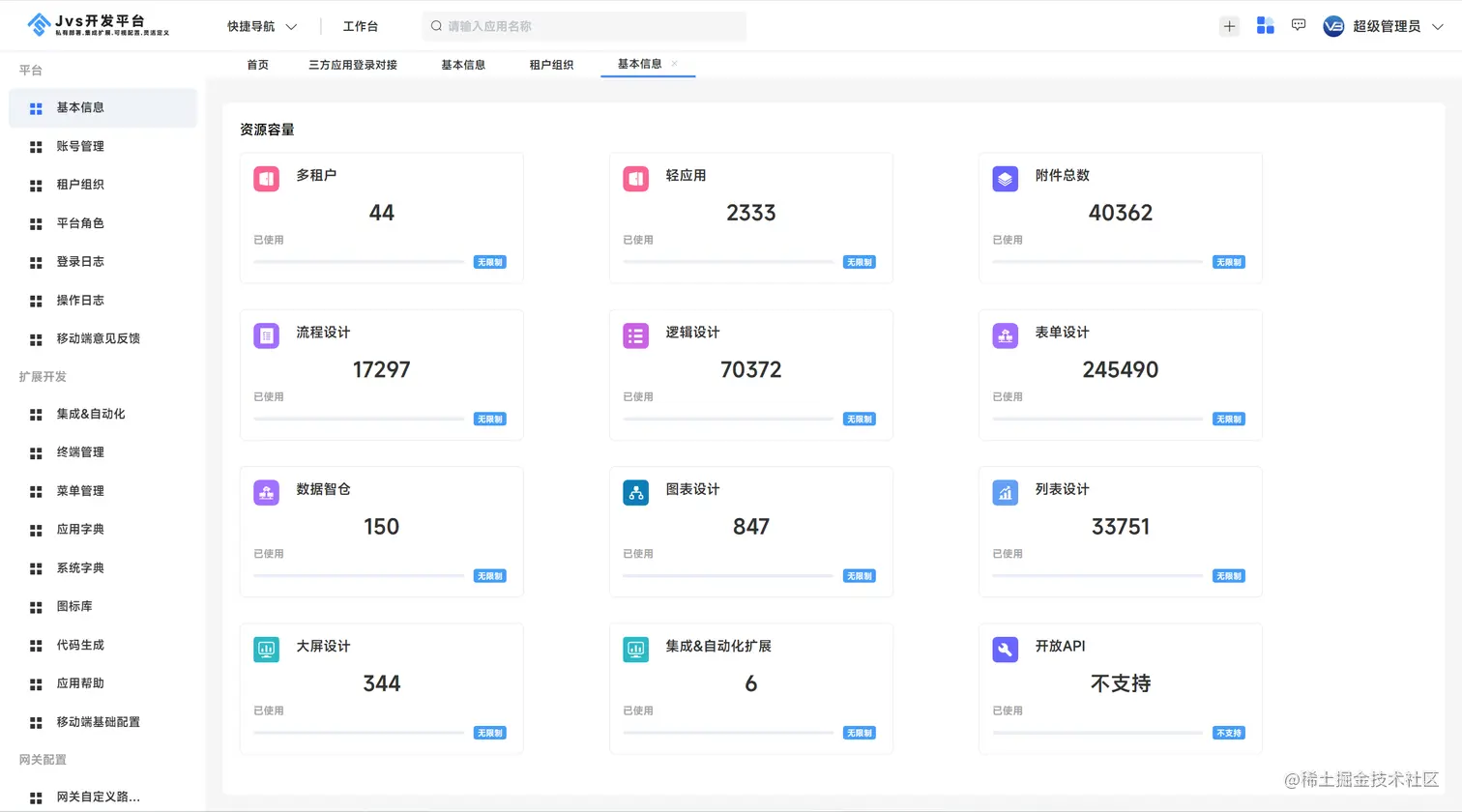 JVS是企业级应用构建的基础脚手架,提供开箱即用的基础功能集成,其中集成了账户管理、租户管理、用户权限体系、三方登录、环境配置、各种业务日志等功能,还提供了对接低代码、数据中台的能力。 - JVS能解决什么?