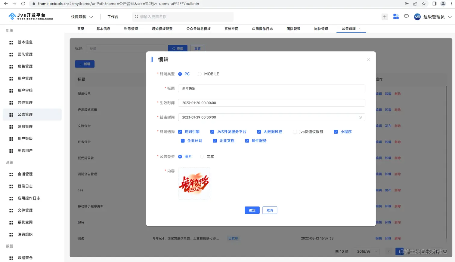 - 公告管理,支持系统的公告发布