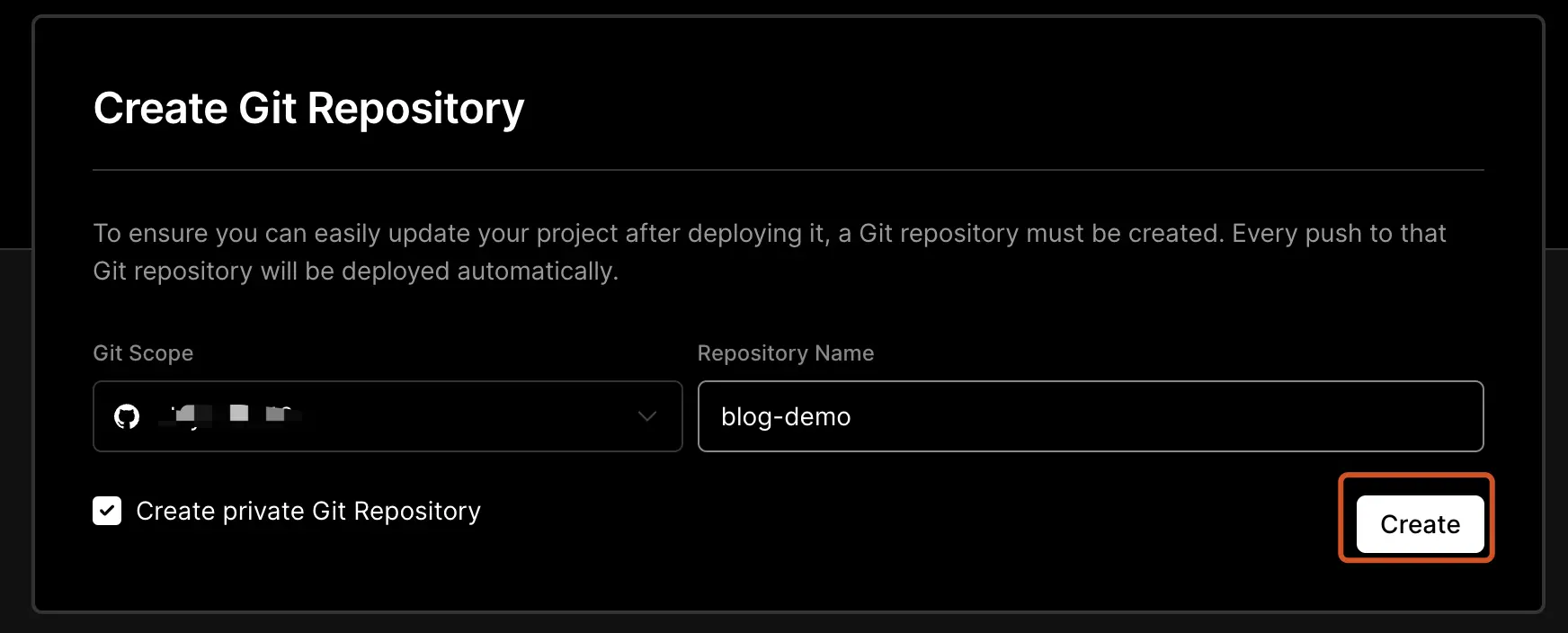 输入你的仓库名 因为我已经创建过了 所以就取 blog-demo