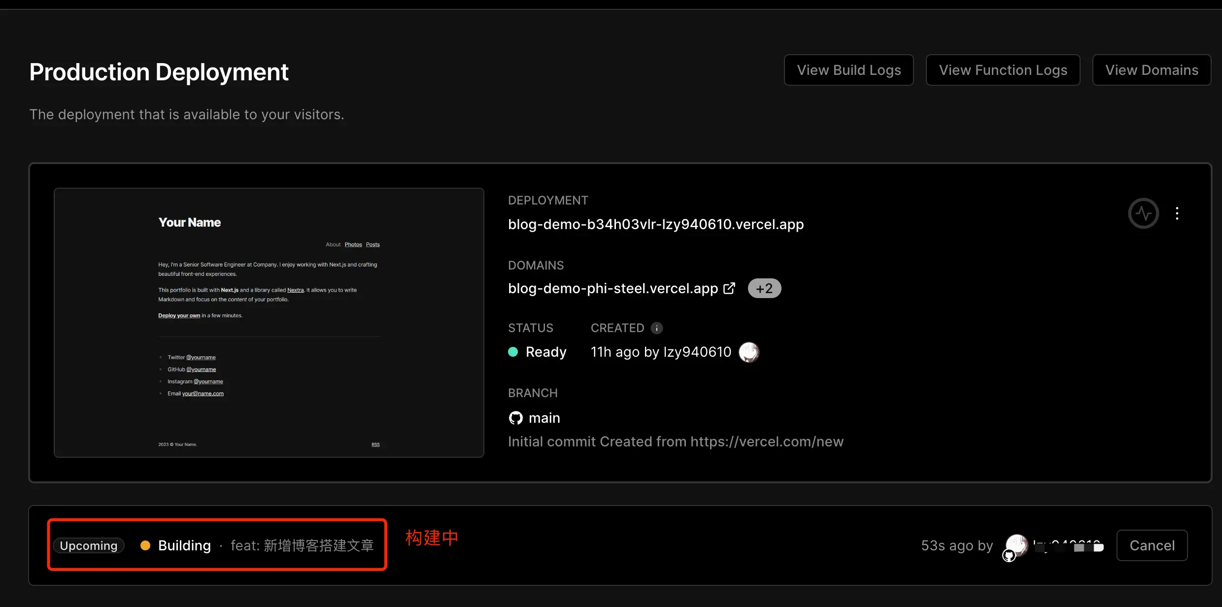 在Vercel项目面板等待部署完成