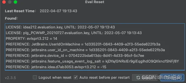 勾选项:Auto reset before per restart 如果勾选了,则自勾选后每次重启/退出IDE时会自动重置试用。