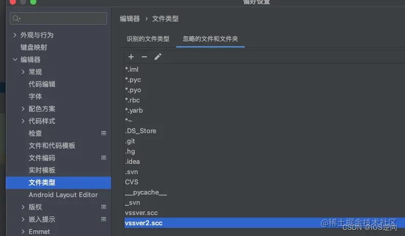 Settings -->Editor --> File Types->忽略的文件和文件夹
