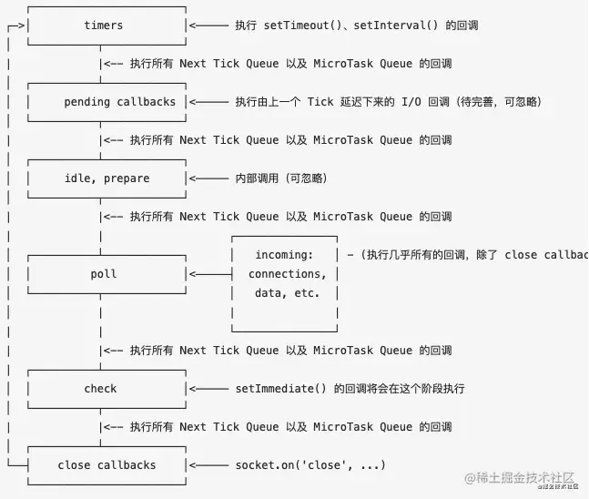 这道题和上一题差不多,但是出现了process.nextTick,所以显然是在node环境下,node也存在事件循环的概念,但是和浏览器的有点不一样,nodejs中的宏任务被分成了几种不同的阶段,两个定时器属于timers阶段,setImmediate属于check阶段,socket的关闭事件属于close callbacks阶段,其他所有的宏任务都属于poll阶段,除此之外,只要执行到前面说的某个阶段,那么会执行完该阶段所有的任务,这一点和浏览器不一样,浏览器是每次取一个宏任务出来执行,执行完后就跑去检查微任务队列了,但是nodejs是来都来了,一次全部执行完该阶段的任务好了,那么process.nextTick和微任务在什么阶段执行呢,在前面说的每个阶段的后面都会执行,但是process.nextTick会优先于微任务,一图胜千言: