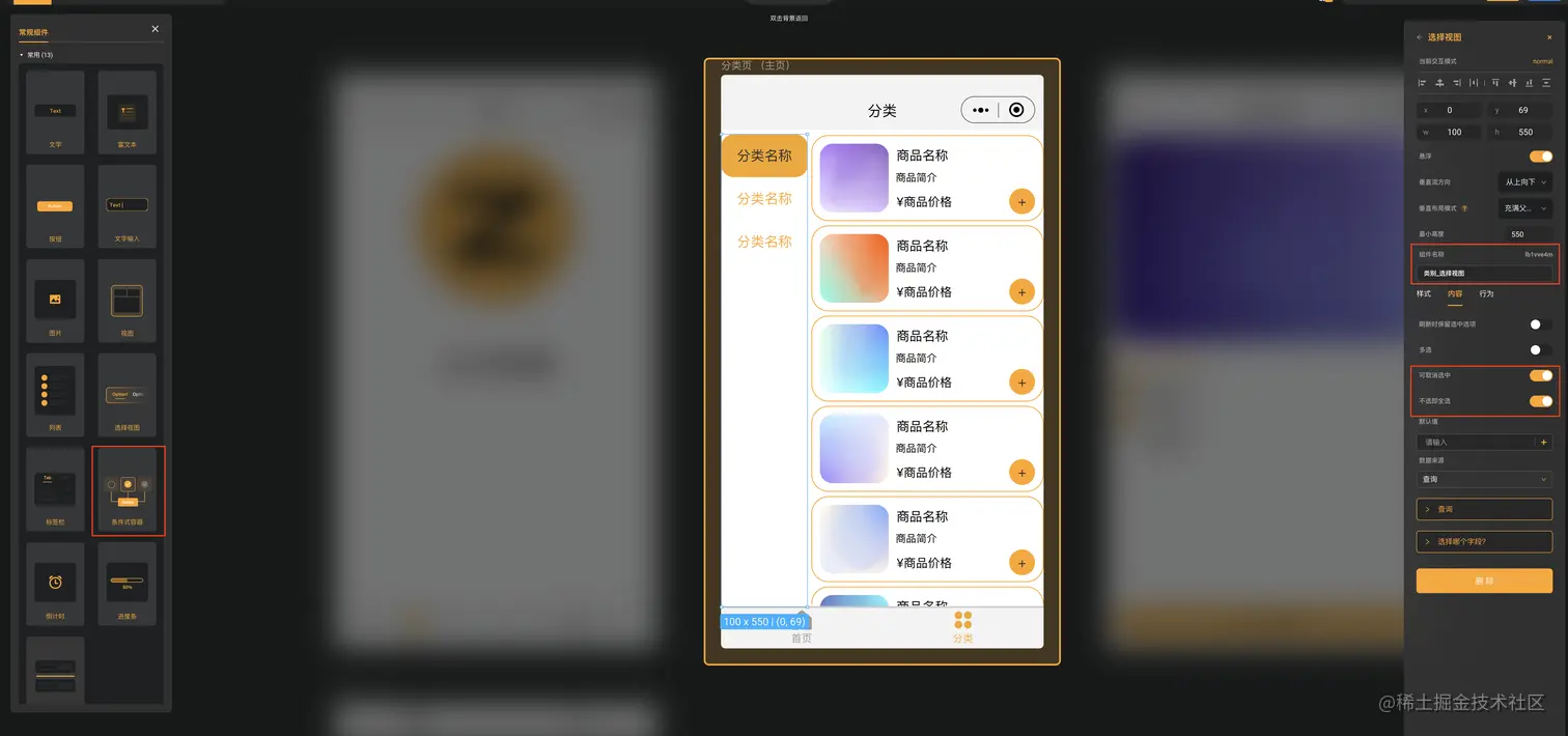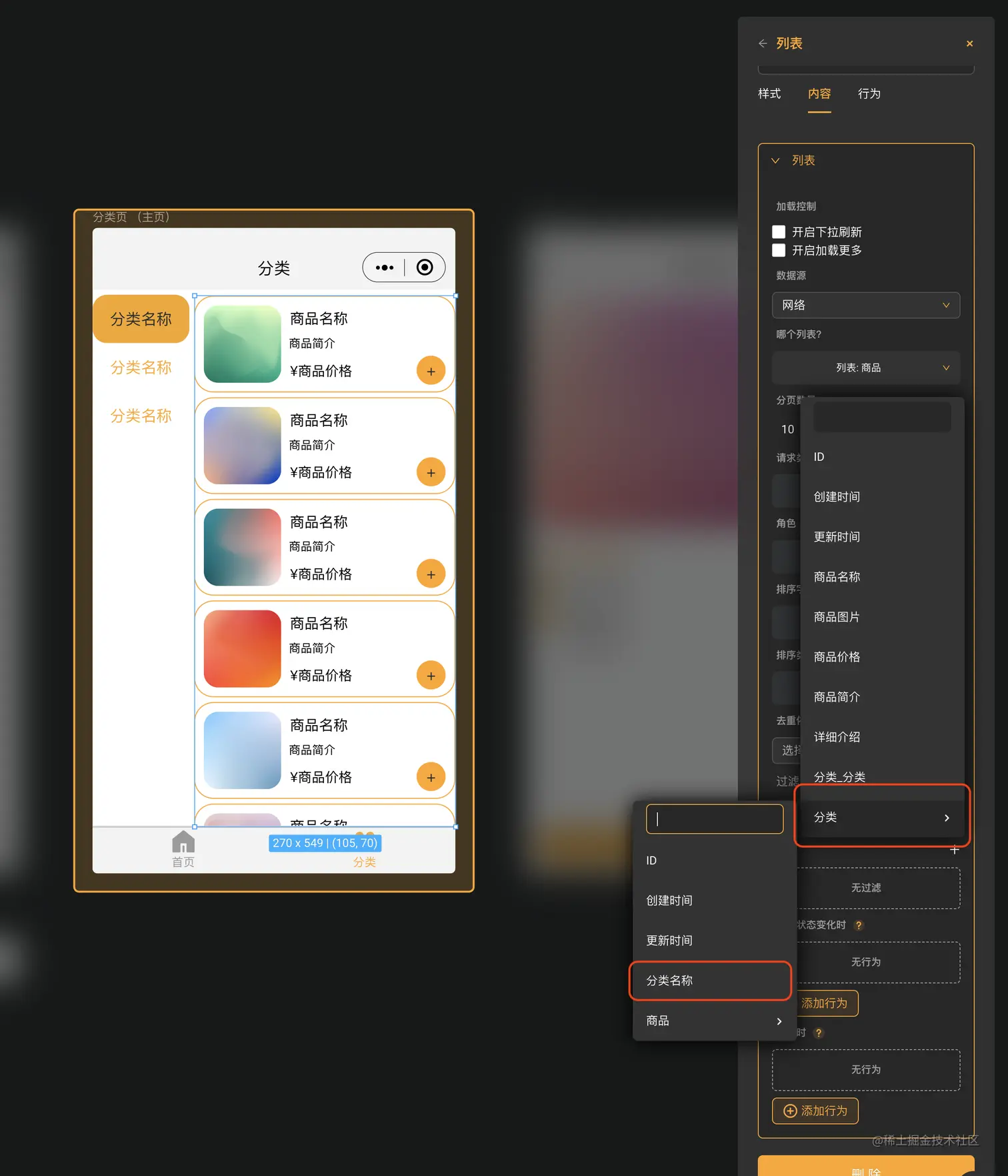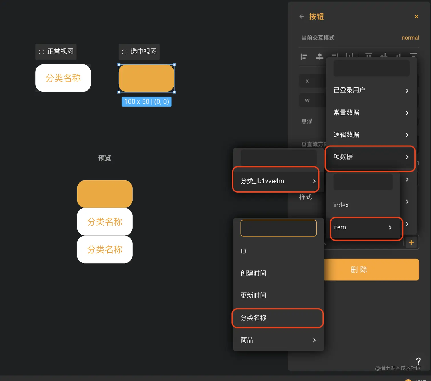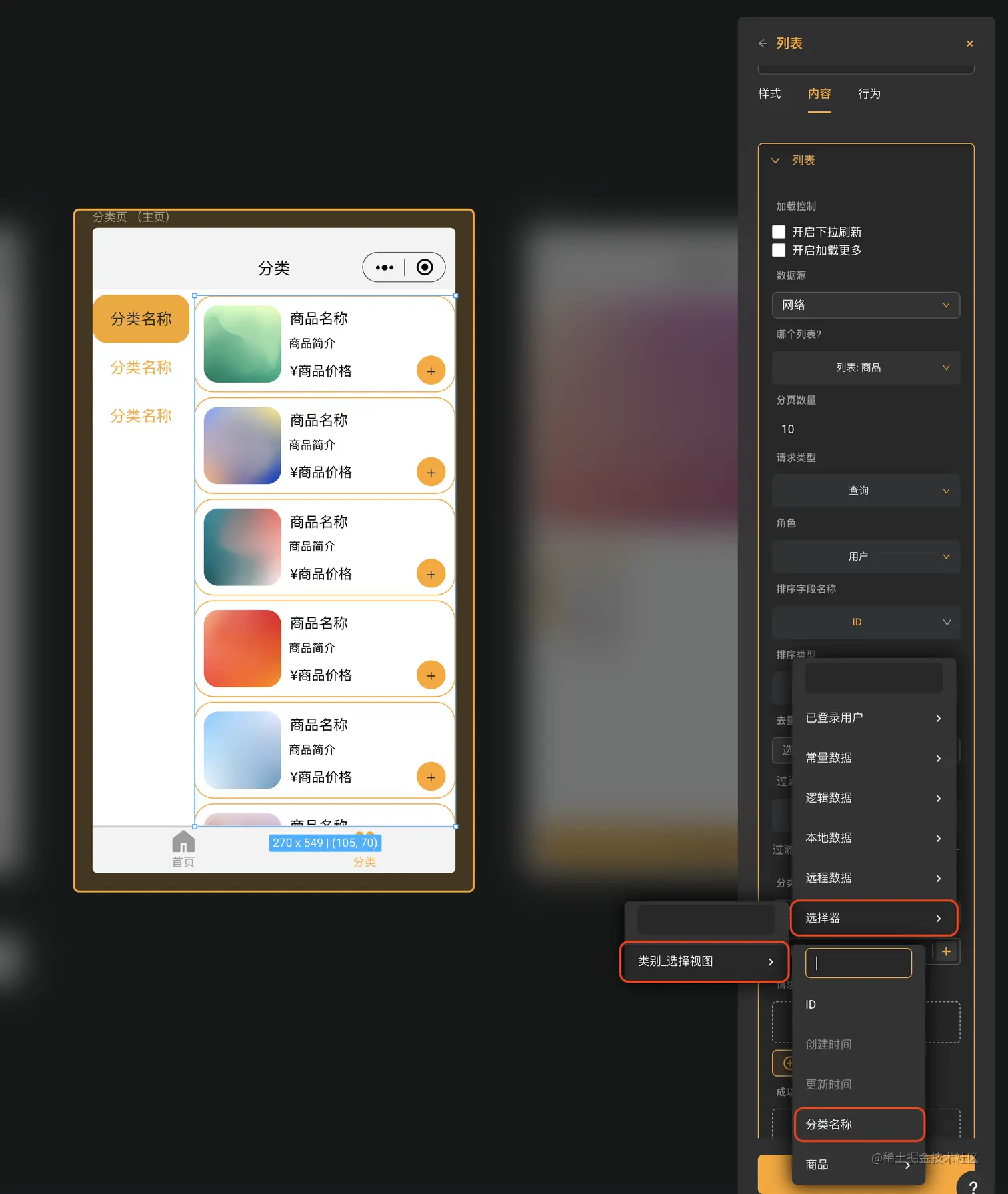 接下来点击选择视图,在选择视图里分别绑上数据,项数据-分类-item-分类名称