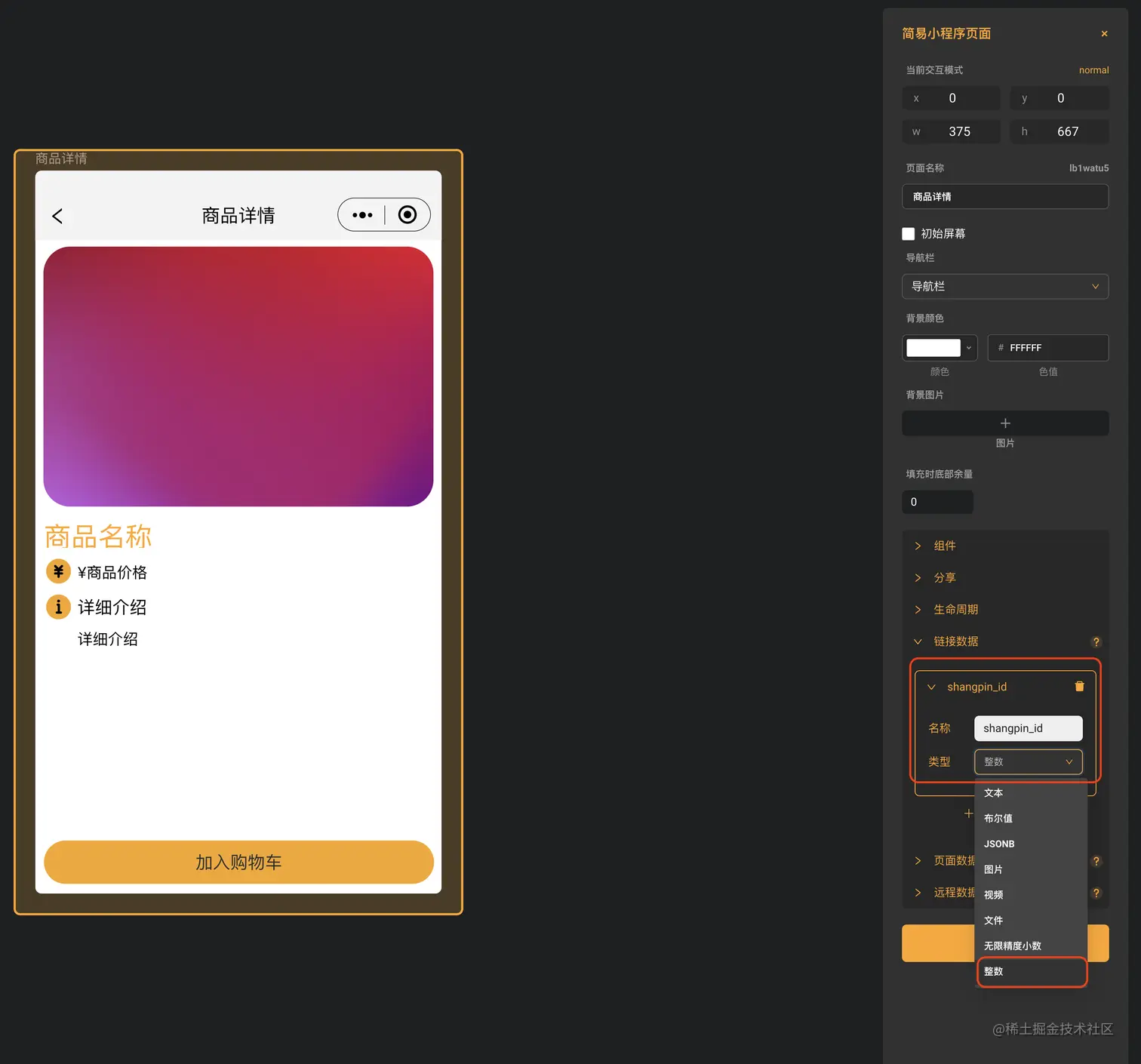 之后选择推入页面之前在商品详情页设的链接数据shangpin_id等于项数据-商品表-item- ID(这边是点击哪一项商品条目的ID就跳转到哪一个商品详情)