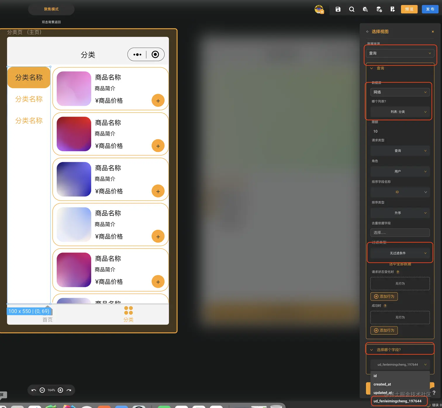 要点击查询数据源为网络,列表选择分类,过滤类型选择无过滤条件,字段选择分类名称(因为我数据模型里用了中文,所以这边显示的是拼音)