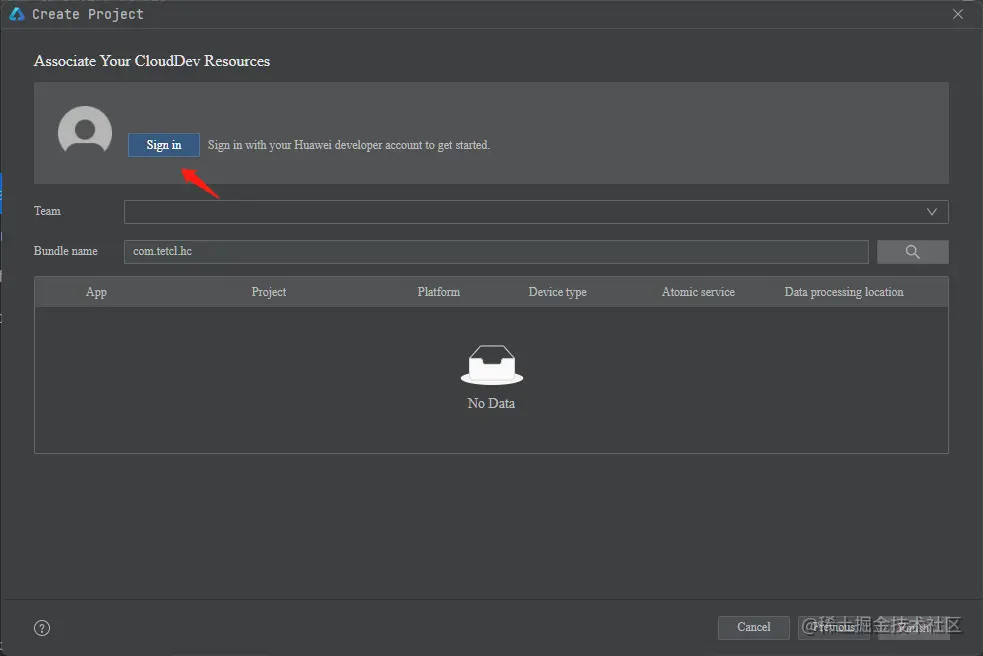 登录完成后在Team下拉框中选择开发团队,若提示以下错误信息,则说明未在AppGallery Connect中创建对应的应用,因此需要先去AppGallery Connect中创建对应的应用。点击错误信息中的AppGallery Connect链接跳转到创建应用界面。