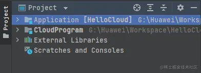 HelloCloud工程创建完成后,在主界面Project页签中会显示详细工程目录,包括端开发工程(Application)、云开发工程(CloudProgram)、端侧公共库(External Libraries)。
